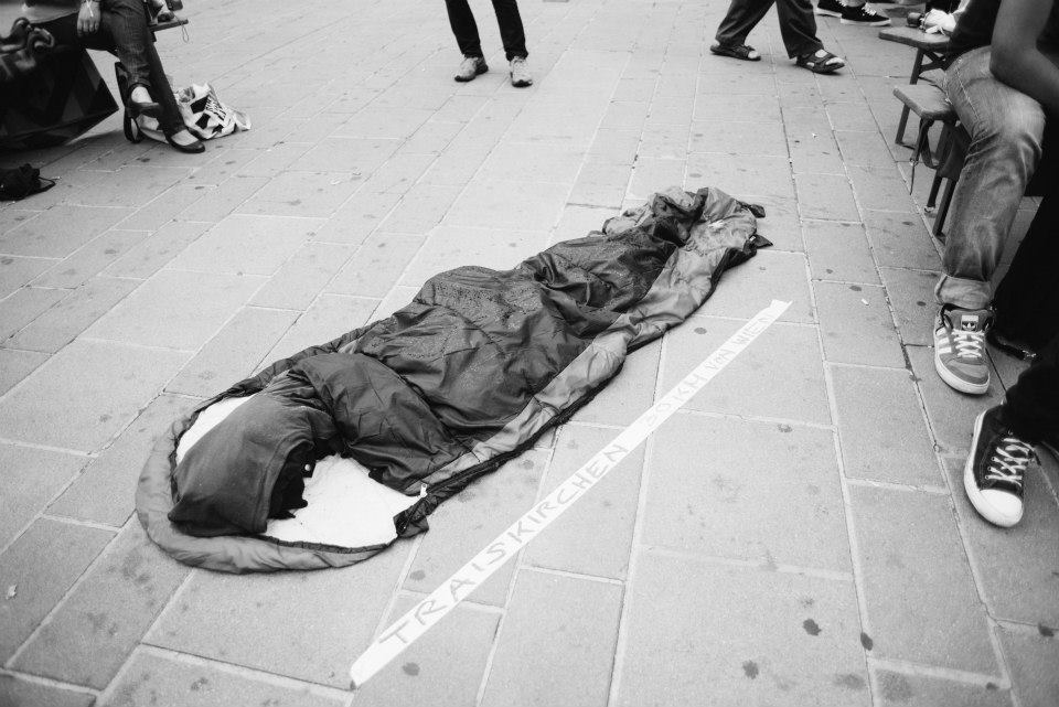 Nehmt Schlafsäcke und Decken mit und legt Euch mit uns auf die Strasse um das Bild, das sich allabendlich auf dem Asphalt des Flüchtlingslager zeigt, in die Stadt zu tragen.